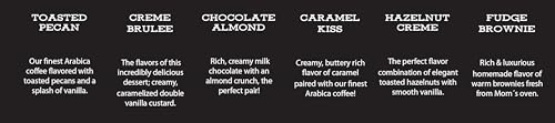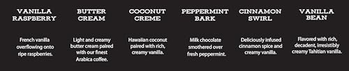 Each box contains 1oz coffee packets of Vanilla Bean, Cinnamon Swirl, Peppermint Bark, Coconut Creme, Butter Creme, Vanilla Raspberry, Fudge Brownie, Hazelnut Creme, Caramel Kiss, Chocolate Almond, Creme Brulee, and Toasted Pecan.
